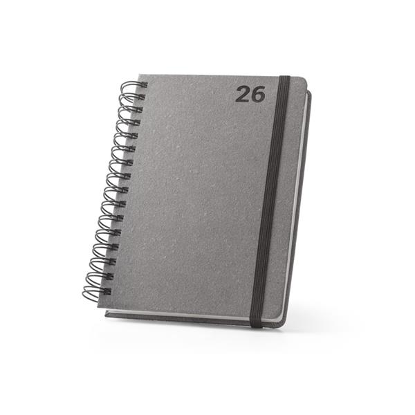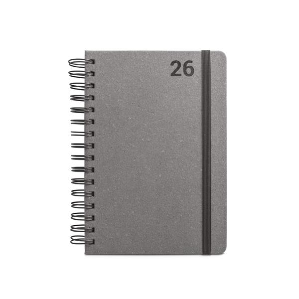 Agenda A5, com argolas, em pele (58% reciclada). Possui um elástico para fecho da agenda. Está organizada num plano diário (70 g/m²). Gravação da logomarca em 1 cor já inclusa.