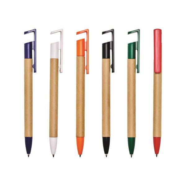Caneta de papelão com suporte para celular, carga esferográfica azul 0,8 mm e acionamento por clique. Gravação da logomarca em 1 cor já inclusa.