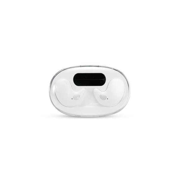 Fones de ouvido intra-auriculares sem fio, com estrutura leve e compacta em plástico e conexão via Bluetooth 5.3, garantindo estabilidade durante o uso. Possui estojo de carregamento com display de LED para visualizar o nível de carga. Acompanha cabo USB-C. Gravação da logomarca em 1 cor já inclusa.