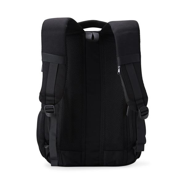 Mochila em poliéster 28 litros com seis compartimentos, sendo o principal com bolso para notebook 15,6 e tablet 12,4. Com divisórias internas para acessórios e porta chave, a mochila possui adaptador USB externo, bolsos laterais telados, duas alças de mãos, área costada e alças para as costas com revestimento espumado. Gravação da logomarca em 1 cor já inclusa.
