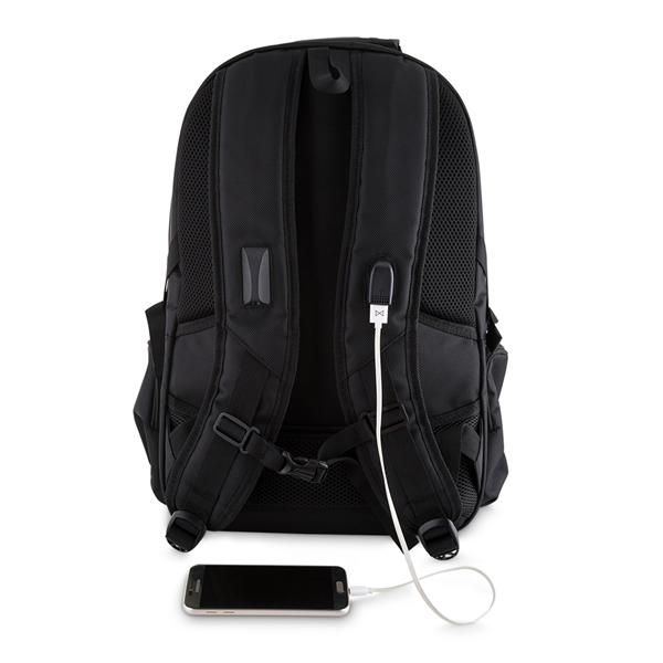 Mochila para notebook em tecido poliéster 1680D (Externo) e 210D (interno). Parte Externa: Alça de mão com cabo de aço e pegador emborrachado; Bolso frontal, dois bolsos laterais; Saída para fone de ouvido e USB; Engate para mala de viagem; Forro de costas acolchoado; Engate para peitoral, ideal para corridas ou caminhadas com a mochila. Parte Interna: Compartimento acolchoado para notebook 29x46cm. Tamanho total do Notebook - 15,6". Porta documentos e caneta. Gravação da logomarca em 1 cor já inclusa.